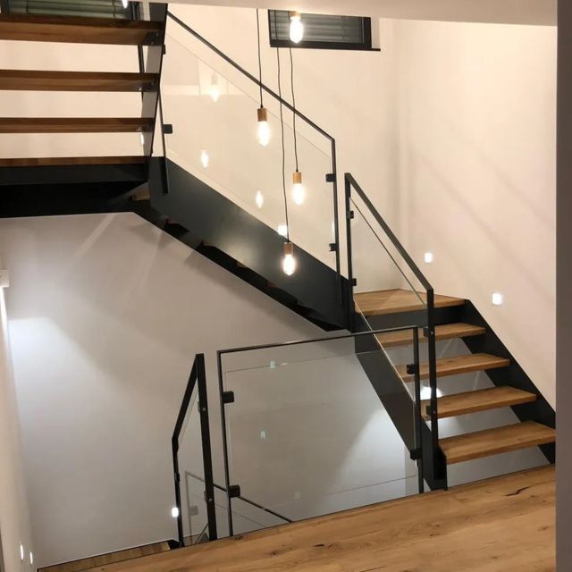 Flachstahlwangentreppen sind moderne Stahltreppen mit einer schlanken, leichten Optik, die durch zwei seitliche Wangen aus flachen Stahlblechen definiert sind. Sie sind äußerst vielseitig in Design und Materialwahl, da sie mit verschiedenen Stufen (oft aus Holz für einen warmen Kontrast) und Geländern kombiniert werden können. Ihr geradliniges Design und die Möglichkeit, sie an unterschiedliche Grundrisse anzupassen, machen sie zu einer beliebten Wahl für den modernen Wohnhausbau.